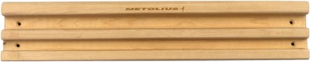 The metolius wood grips ii compact hangboard features a variety of holds placed in a symmetrical design and includes two warm up jugs plus a variety of pockets and slopers for training.